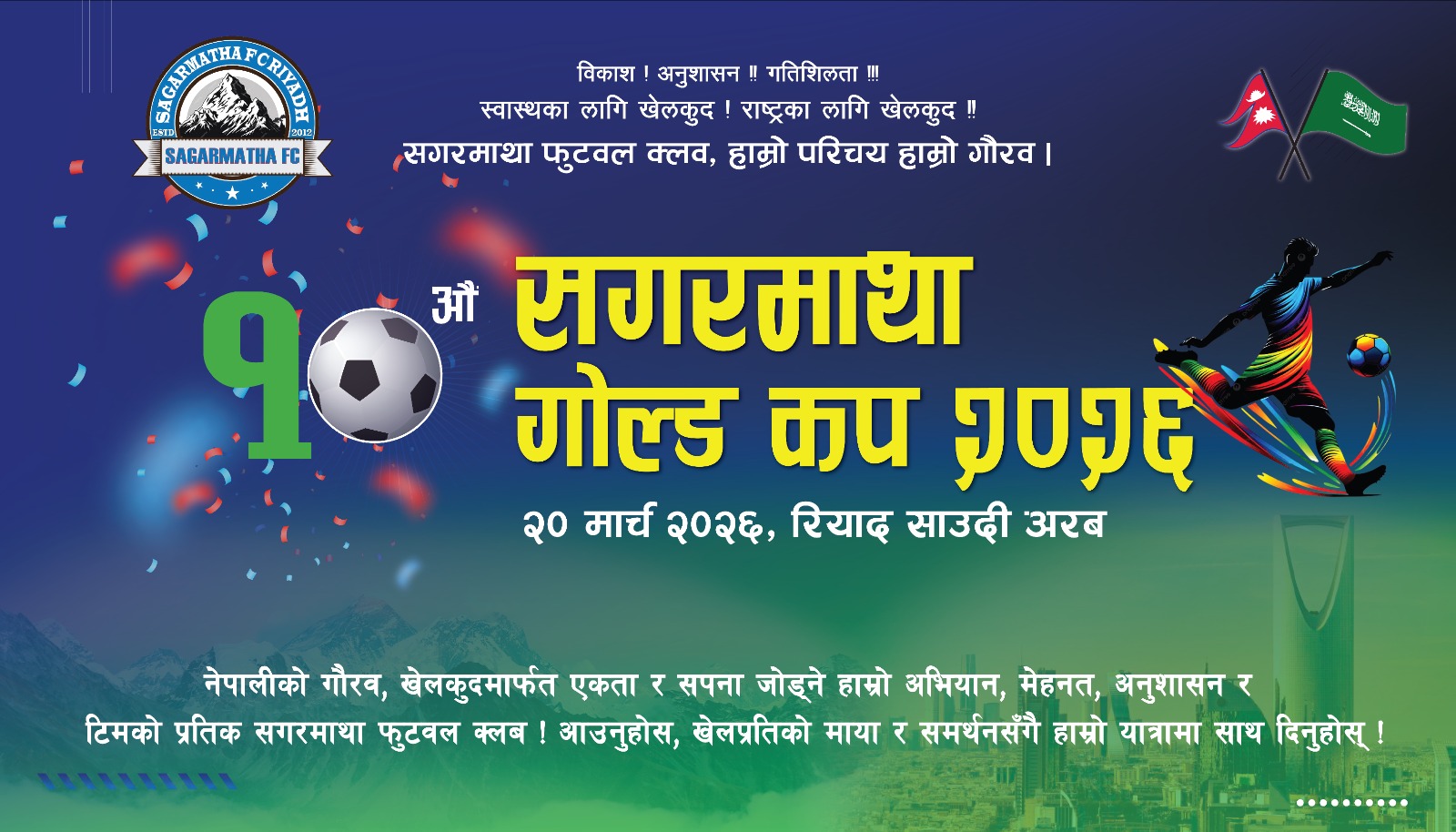 काठमाडौँ । साउदी अरबको रियादमा आयोजना हुने “१०औँ सगरमाथा गोल्ड कप २०२६” स्थगित गरिएको छ। मार्च २० र २१ मा सञ्चालन हुने तय गरिएको उक्त प्रतियोगिता मध्यपूर्वमा विकसित पछिल्लो परिस्थितिका कारण अर्को सूचना नआएसम्मका लागि स्थगित गरिएको हो। सगरमाथा फुटबल क्लबका सचिव दावा शेर्पाका अनुसार