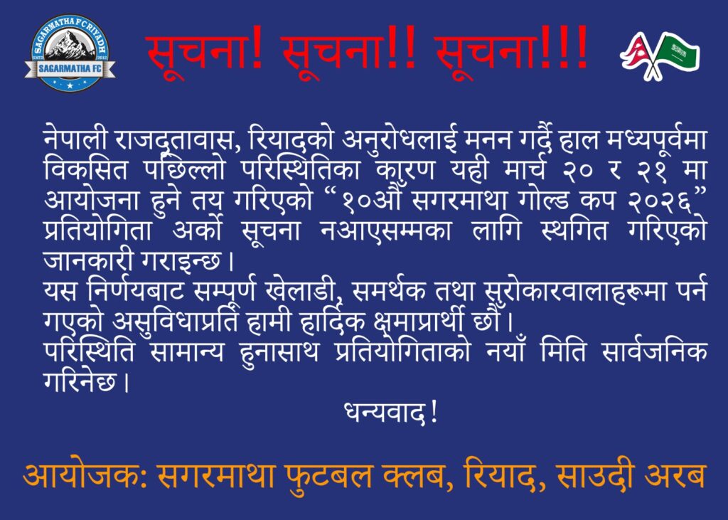 साउदीको रियादमा हुने “१०औँ सगरमाथा गोल्ड कप २०२६” स्थगित 71 Shares काठमाडौँ । साउदी अरबको रियादमा आयोजना हुने “१०औँ सगरमाथा गोल्ड कप २०२६” स्थगित गरिएको छ। मार्च २० र २१ मा सञ्चालन हुने तय गरिएको उक्त प्रतियोगिता मध्यपूर्वमा विकसित पछिल्लो परिस्थितिका कारण अर्को सूचना नआएसम्मका लागि स्थगित गरिएको हो। सगरमाथा फुटबल क्लबका सचिव दावा शेर्पाका अनुसार नेपाली राजदूतावास, रियादको अनुरोधलाई ध्यानमा राख्दै प्रतियोगिता स्थगित गर्ने निर्णय गरिएको हो। हाल इजरायल, अमेरिका र इरानबीच बढ्दो तनावका कारण मध्यपूर्व क्षेत्र प्रभावित बनेको बताइएको छ। प्रतियोगिता स्थगित हुँदा खेलाडी, समर्थक तथा सरोकारवालामा पर्न गएको असुविधाप्रति आयोजकले क्षमायाचना गरेका छन्। साथै, परिस्थिति सामान्य भएपछि प्रतियोगिताको नयाँ मिति सार्वजनिक गरिने जानकारी दिइएको छ। आयोजकका अनुसार प्रतियोगितामा साउदी अरबमा क्रियाशील विभिन्न नेपाली समुदायका फुटबल टोलीहरूको सहभागिता रहने थियो। प्रतियोगितामार्फत प्रवासी नेपालीबीच सद्भाव, एकता, सहकार्य तथा स्वस्थ प्रतिस्पर्धाको भावना विकास गर्ने लक्ष्य राखिएको छ। साथै, खेलकुदमार्फत नेपाली पहिचानलाई सुदृढ गर्दै युवालाई खेल क्षेत्रमा प्रेरित गर्ने उद्देश्यसमेत रहेको जनाइएको छ। पुरस्कारतर्फ विजेता टोलीले ७ हजार साउदी रियालसहित ट्रफी र प्रमाणपत्र प्राप्त गर्नेछ भने उपविजेताले ३ हजार ५ सय साउदी रियालसहित ट्रफी र प्रमाणपत्र पाउनेछन्। प्रत्येक खेलमा ‘म्यान अफ द म्याच’सहित विभिन्न विधागत पुरस्कारहरू समेत वितरण गरिनेछ। विगतका संस्करणहरू सफलतापूर्वक सम्पन्न हुँदै आएको सगरमाथा गोल्ड कपले रियादस्थित नेपाली समुदायमा खेलकुदप्रतिको आकर्षण बढाउँदै आएको आयोजकको दाबी छ। प्रतियोगिताले खेल प्रतिभा पहिचान तथा सामाजिक सद्भाव सुदृढ गर्न महत्वपूर्ण भूमिका खेल्दै आएको बताइएको छ।